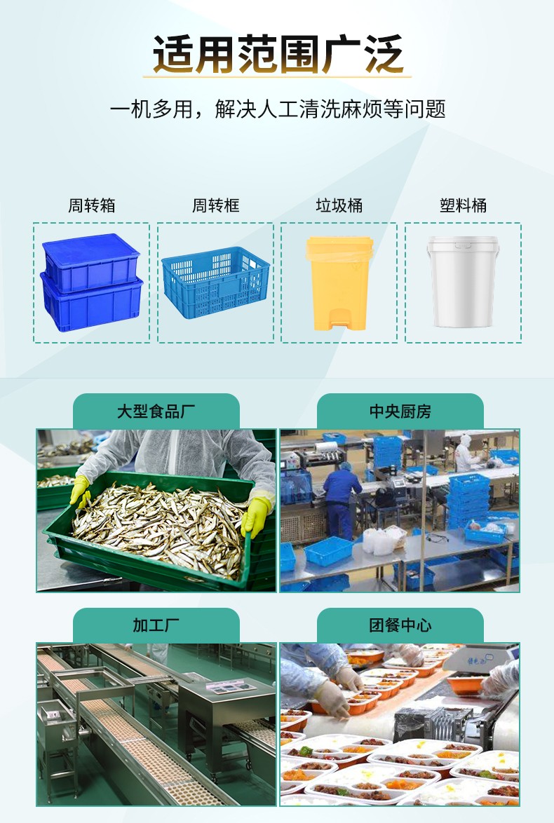 适用于大型食品厂、中央厨房、团餐中心、汽车制造厂等需要批量清洗周转容器的场所。